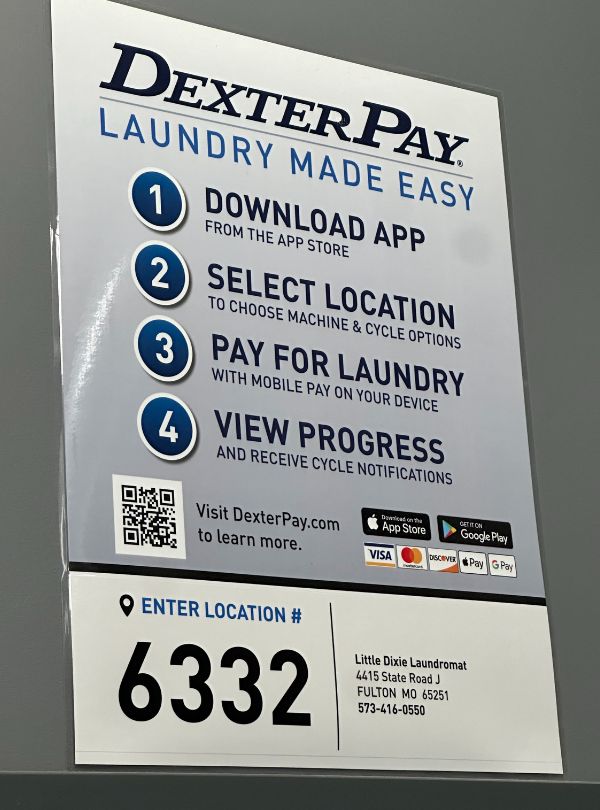 LAUNDROMAT IN MILLERSBURG MISSOURI FEATURES DEXTER AND SPEED QUEEN MACHINES WITH REAL-TIME MONITORING VIS THE DEXTER PAY APP AND BILL CHARGER ON-SITE.
